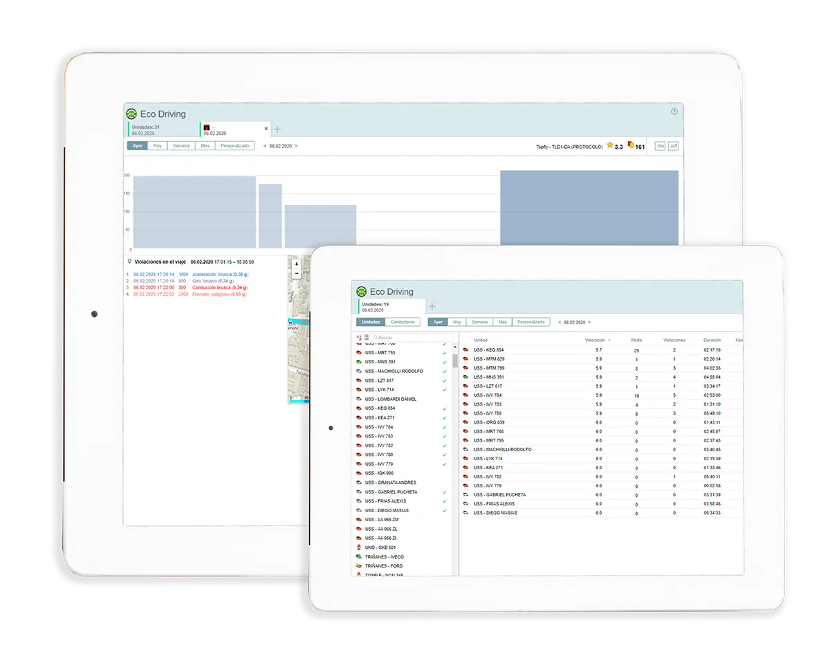 Esta aplicación permite analizar y valorar la calidad de conducción de todos sus conductores. Con la detección de frenadas, aceleradas, giros bruscos y excesos de velocidad, Ecotracker genera un Scoring de Conductores, aplicando puntajes y multas internas en función de la forma de conducir. Con este control nuestros clientes se benefician al prolongar la vida útil de sus vehículos, disminuir gastos de combustible, evitar multas y garantizar la seguridad de la carga, los conductores y los pasajeros.